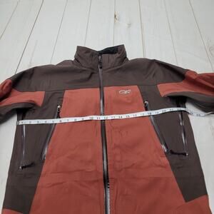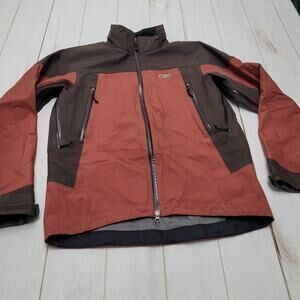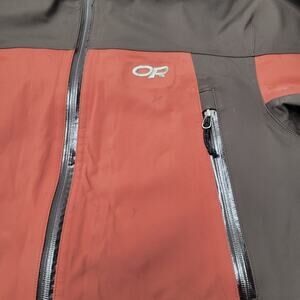 Well-designed Outdoor Research "Foray" waterproof jacket! Lots of storage pockets and under arm zippers for added breathability. Jacket is MISSING the hood and has some scattered stains but is overall in sturdy condition and the water-tight seams are well intact. Interior has attracted some hairs and lint that don't want to come up with lint rolling. Size medium