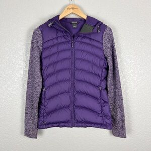This Outdoor Research Plaza down hoodie in Elderberry combines a quilted duck down body with cozy fleece-lined sleeves for warmth and mobility. Lightweight, windproof, and water-resistant, it’s ideal for layering during outdoor adventures in cooler weather. Size Small.