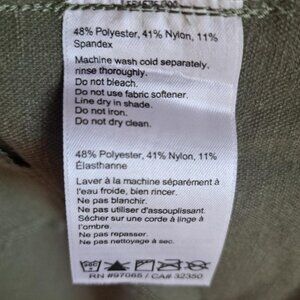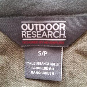 Outdoor Research short, lightweight (unlined), fitted women's coat in a heathered army green. Size S/P. Off center front zipper with funnel neck that snaps shut. Sleeves have a snap at the wrist. Two front slash pockets with zippers. Fabric has stretch and is 48% Polyester, 41% Nylon and 11% Spandex. Machine washable. Never worn. Non-smoking household.