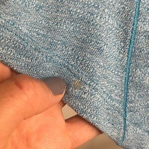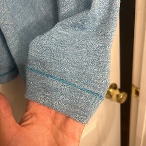 Pretty blue long sleeve that can worn open front like a cardigan or wrapped around and tied in back like a shirt. Lightweight but warm, perfect for throwing in your bag. Has a small back zip pocket to stash your cards, chapstick, or key fob. Essential piece if you have places to go after your sweat sessions! Small discoloration at the hem, see pic with finger, no other flaws.
