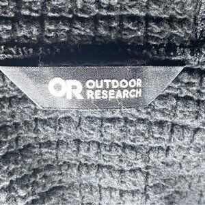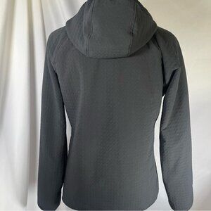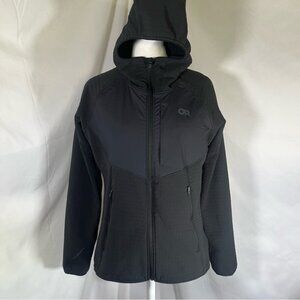 Outdoor Research Women's Vigor Fleece Hoodie Full-Zip Jacket. Black. Size Small. Designed for warmth and comfort. Perfect on its own or as a part of a strategic layering system. The trim fit silhouette features a breathable, hybrid-mapped construction and movement-mirroring stretch. Water and wind resistance. Grid fleece interior is moisture-wicking and soft against the skin. The 3-panel hood delivers a sleek, close fit. Zip chest and hand pockets, and stay visible during night adventures with the reflective logo. In excellent used condition.