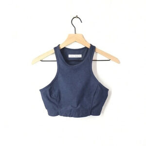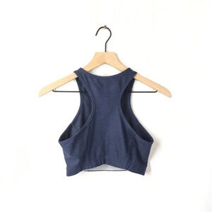High neck, racerback sports bra that has flat seams to reduce chafing. Moisture wicking fabric is four way stretch. Banded logo hem.