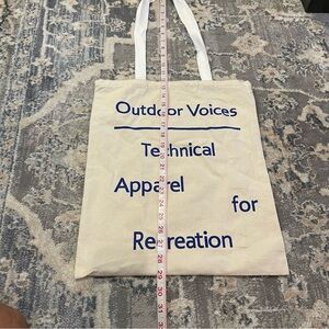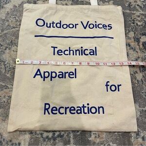 Stylish canvas tote bag from Outdoor Voices. Features bold blue text on a beige background. Perfect for carrying essentials.