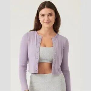 Size Xsmall. Outdoor Voices Cozy Rib Knit Cropped Snap Cardigan in Earl Gray/Purple. Stay cozy and stylish with this Outdoor Voices Earl Gray Purple Cozy Rib Knit Cropped Cardigan. The rib-knit texture adds a touch of elegance, while the cropped length makes it perfect for layering over your favorite outfits. This cardigan is a versatile piece that can be dressed up or down. Pair it with high-waisted jeans and a t-shirt for a casual look, or layer it over a dress for a more polished outfit. Perfect for staying warm and stylish on cool days. Features: Rib-knit texture, cropped length, long sleeves, chunky snap button front. 63% polyester, 34% rayon, 3% spandex. All measurements are approximate.