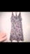 Vibrant strappy dress with a bold pattern. Features shades of black, purple, and red.