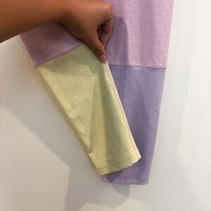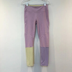 These fun colorblock leggings from Outdoor Voices are a pink color with yellow and purple dipped bottoms and a high waist/high rise! Preloved but in excellent used condition (EUC)!