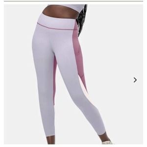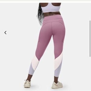 Features: purple and pink colorblocked leggings, high rise, 7/8 length, sweat-wicking fabric, side pockets
