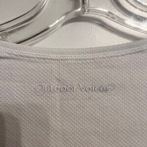 Stay cool and comfortable with this lightweight Outdoor Voices racerback tank top in crisp white. Made with a breathable, sweat-wicking fabric, this top is ideal for low- to medium-impact workouts, hot summer days, or layering over your favorite sports bra. Designed with a relaxed fit and scoop neckline, it's perfect for movement and versatility.