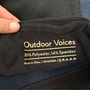 Outdoor Voices Two Toned Blue Navy Active Leggings Size Small. 86% polyester, 14% spandex. Waist across front 12 1/2 inches. Rise 8 1/2 inches. Inseam 23 inches. Size small. Good used condition.