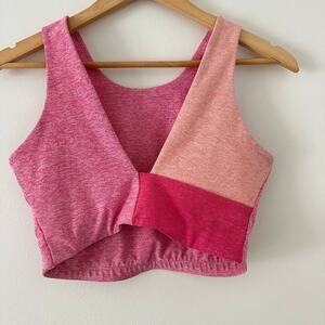 Details: Outdoor Voices Venus Crew Neck Colorblock Crop Top Bra - Size: S- Color: Pink- Material: Polyester/spandex - Features: Cropped, sleeveless, pullover, crew neck, stretch, colorblock patter, comfort, breathable, casual, activewear.
