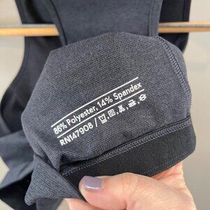 This racerback crop tank / Sports bra from Outdoor Voices is made from a blend of polyester and spandex, providing a comfortable fit and excellent flexibility. Ideal for active lifestyles, its sleek gray color complements various workout ensembles while offering breathability and durability. Light coverage.