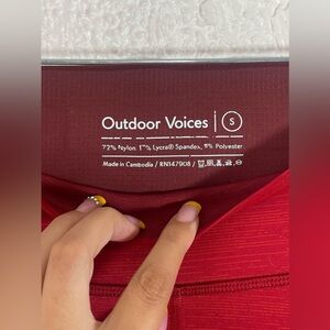 Outdoor Voices Zoom Maroon Red Orange Tri Color Block 7/8 Leggings Women’s Size Small. Nylon, Spandex and Polyester. Made in Cambodia.