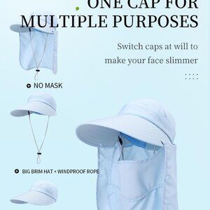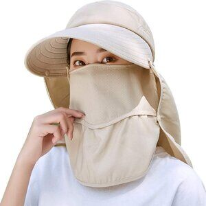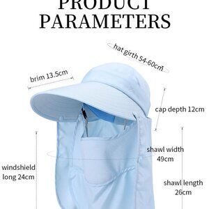 unique design,360 degree full coverage for head,face,ears and neck,whole surrounded by a large detachable shawl,neck flap and breathable face cover mask are free removal, 5.5 inch wide brim visor, protect you from from strong sun light during outdoor activities.