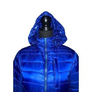 Blue puffer jacket. Hidden hood with drawstring. Full zip closure. Elastic cuff. Side zip pockets. 100% polyester. Size: small. Preowned in good condition.