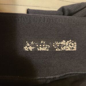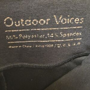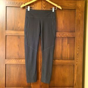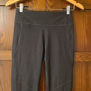 Outdoor Voices leggings in 23.5" length. The brand info is worn but overall leggings are in excellent shape including gusset as shown. The color could be described as a washed black or dark charcoal gray (they r more black to my eye). Unsure of exact style name.