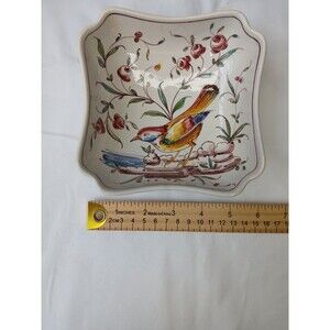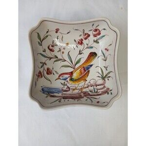 The product is a small square soup bowl hand-painted with a bird design by Outeiro Agueda, a brand known for its art pottery. Made of ceramic, this unique piece originates from Portugal and features a painted backstamp. Designed with cherries and a bird motif, this decorative and functional bowl is perfect for serving soups or stews in an elegant and artistic style. To maintain its quality, it should be hand-washed only, making it a special addition to any kitchen or dining table.