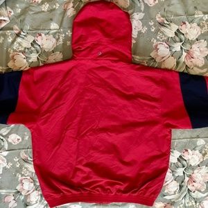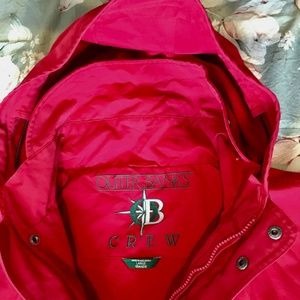 Outer Banks Red Navigator Mens Boating Jacket. Mint condition with no flaws, black striped sleeves and double layers rain hood. Water proof zipper on front and pockets!