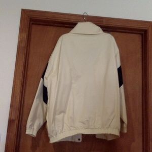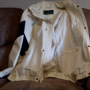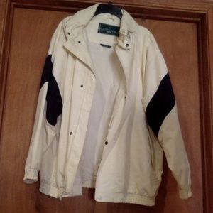 Outer Banks light weight jacket with hood, cream and black, men's size XL, Shell = 70% cotton, 30% nylon, Body Lining = 100% cotton, Sleeve Lining = 100% nylon. Good shape.