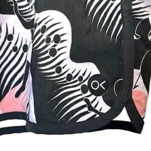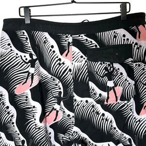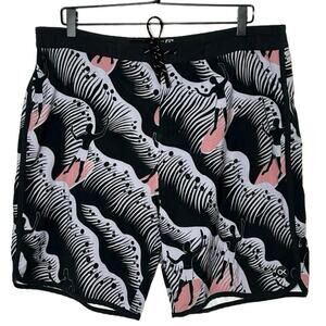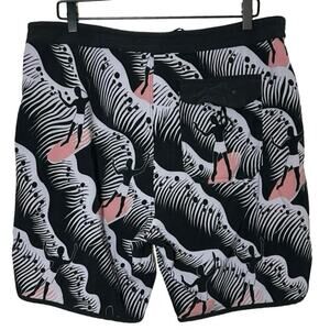 Outer Known Board Shorts in a Black and Gray surfer motif in size 36. Made in a Fair Trade Certified Factory of 86% recycled polyester, 8% recycled spandex and 6% spandex. Zip and drawstring closure. One back zip pocket. Cool surfer motif design in black and gray with splashes of mauve. Excellent condition! Measurements: inseam- 8 inches and Waist- 36.