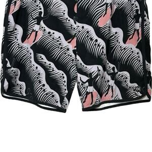 Outer Known Board Shorts in a Black and Gray surfer motif in size 36. Made in a Fair Trade Certified Factory of 86% recycled polyester, 8% recycled spandex and 6% spandex. Zip and drawstring closure. One back zip pocket. Cool surfer motif design in black and gray with splashes of mauve. Excellent condition! Measurements: inseam- 8 inches and Waist- 36.