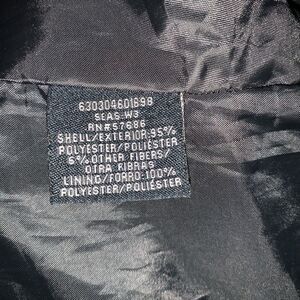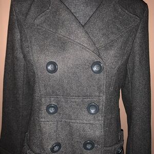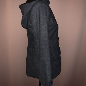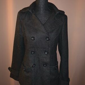 Dark gray double breasted pea coat with hood. Two waist pockets. Fully lined. Shell: 95% polyester/5% other fibers. Lining: 100% polyester. Size: small. Preowned. Inner button is missing but in good condition.