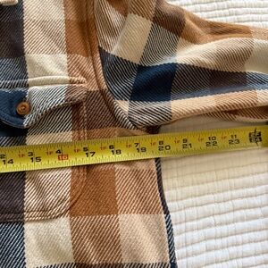 Outerknown Blanket Shirt in blue and tan Sandy Montana Plaid, men's size XS, fits like a women's S/M. Approximately 20" pit to pit, 28.5" long.
