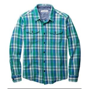 Stay cozy and stylish in this Outerknown Womens Blanket Shirt. Designed with Outerknowns signature laid-back feel, this button-up features a bold green, blue, and white plaid pattern that pairs perfectly with jeans, leggings, or layered over a tee. Made with 100% organic cotton heavyweight twill, it offers a soft, brushed texture that feels like your favorite blanket.