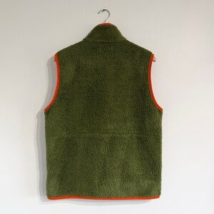 Retro style Sherpa vest from outerknown. Green color with orange and blue accents. Zippered secure hand and chest pockets. Good preowned condition.