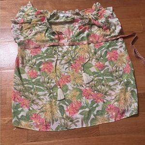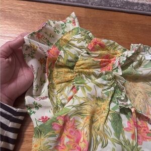 Vibrant floral blouse with ruffle sleeves. Features pink and green tropical print.