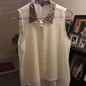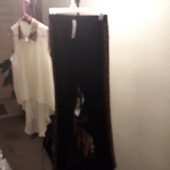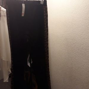 Leopard print pants and high low shirt nylon shirt and leather pants.