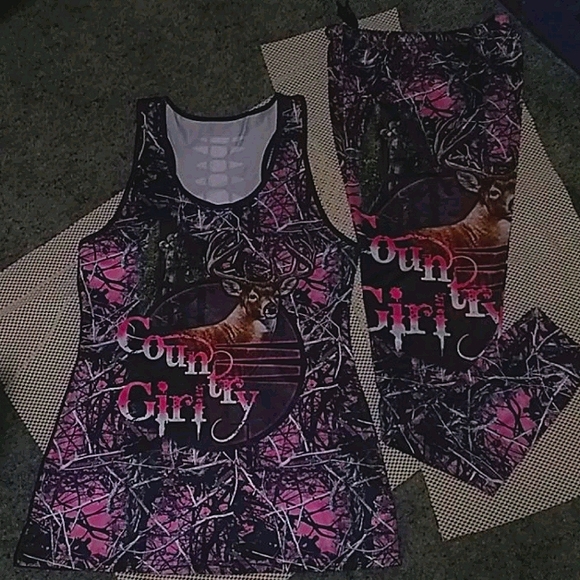 Pink camo leggings & top. Has country girl on the front of the shirt and down the leg of the pants. Size medium