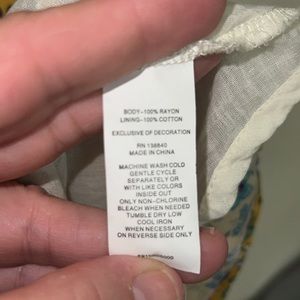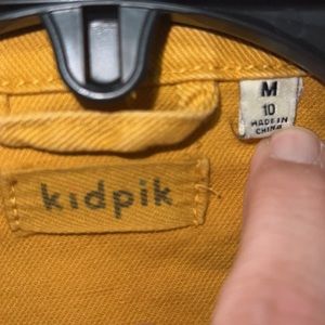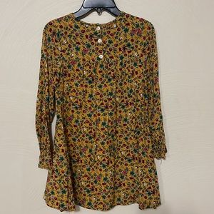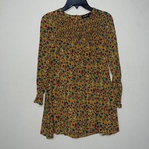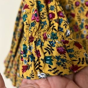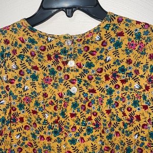 Dress and denim jacket. Jacket and dress are a mustard yellow. Worn one time. The dress is fully lined. The dress has a floral pattern. The flowers are a dark teal blue, some white, some pink with maroon. The neckline buttons at the back with three buttons.