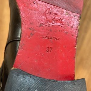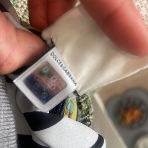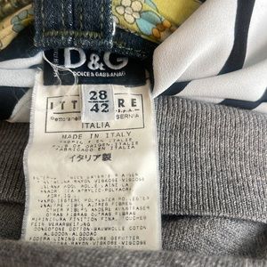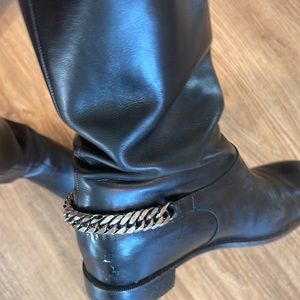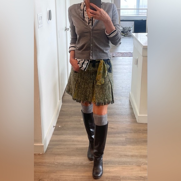 SKIRT: Dolce&Gabana tweed pleated skirt: pleats have inner sheer floral fabric frayed hem matching sheet fabric waist tie. Belt loops and two front pockets are adorned with two buttons and dark jean fabric. CARDIGAN: banana republic small button up BLOUSE: the limited black and white portifino slim cut front button up small BOOTS. Christian Louboutin riding boots black leather 37 silver chain on heel slip on