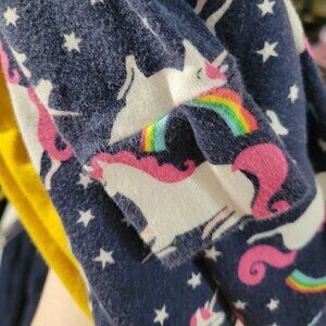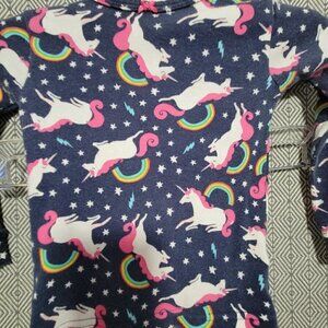 ●This matching pajama set features a long sleeve dark blue shirt with flying Unicorns, Rainbows, lightning bolts, and white stars, with a small pink bow in the middle of the shirt