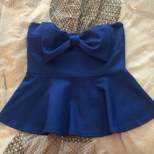 Strapless blue peplum top with cute bow (Joyce Leslie size Medium). Bodycon pencil skirt with lace over lay (H&M size 10). Can be worn together or separately!