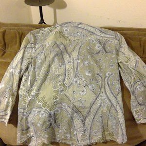 Size 4 green and black floral print Ann Taylor dress blouse. Gently worn, 100% cotton. Dark green wrap around skort, Banana Republic (size 2).