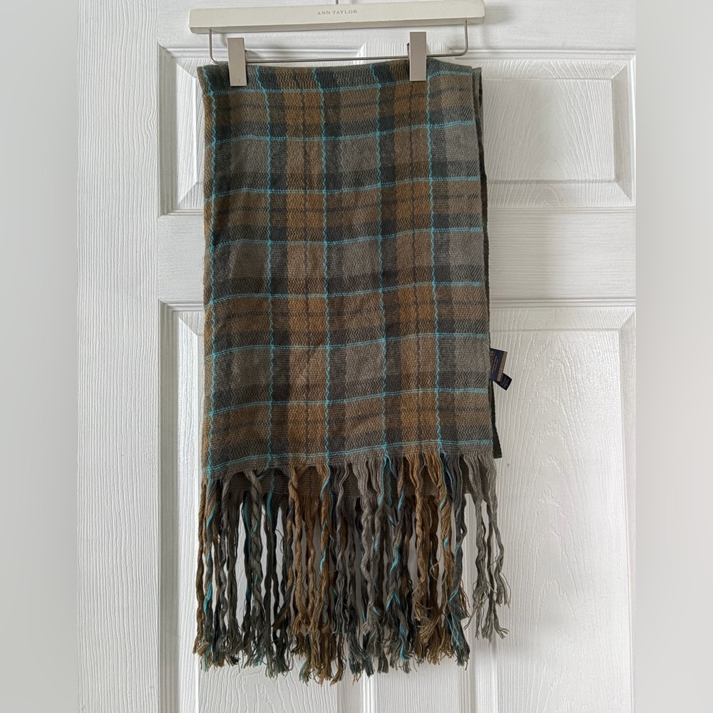 Cozy plaid scarf with fringe. Features green and brown tones with blue accents.