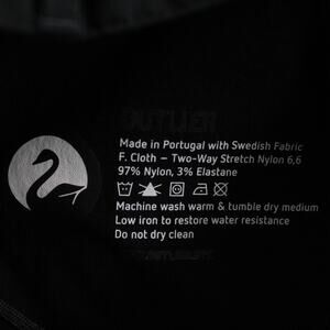 Branding: OUTLIER swan logo and printed care/tech label inside