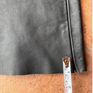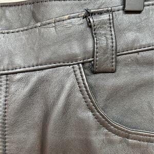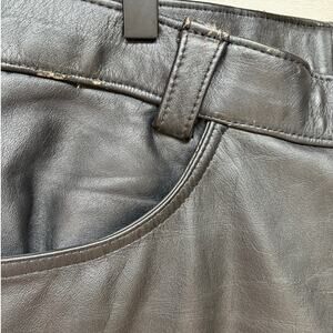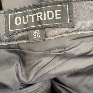 Outride leather moto pants in good condition without a lot of wear but there is some creasing from storage, a few minor nicks and scuffs around waistband and crotch, light specks on left buttock, and about 1 inch split on hem of inner right leg-see photos. These pants are made from a heavy, pliable leather and are lined to below the knees. The hems are raw edged, the lining is intact and clean with no worn spots, the zip is brass YKK, and all hardware works. Measures app'x: 17.5 inches across waist, 12 inch rise and 36 inseam.