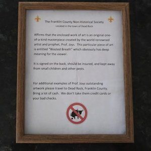 Own the world's only "Wasted Breath" sculpture by self-proclaimed artist & prophet Prof. Joys of Franklin County ... and feel warm inside knowing proceeds go to Homeward Bound of Western NC which has now brought more than 2,615 unhoused people out of the cold into homes of their own. Signed in pen and accompanied by a certificate of authenticity that's sure to make an impression on even the biggest art snob. Invest now before the price goes higher!