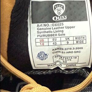 Experience the rugged durability of Ouxx boots, crafted in a classic tan and brown color. These high-top boots feature a traditional lace-up system with metal eyelets and a padded collar for added comfort. Built with a thick, rugged sole, they are perfect for demanding work environments.