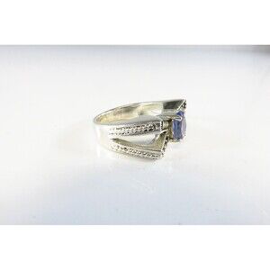 Oval blue glass marcasite accented Art Deco style bow ring sterling silver - Size 7.25