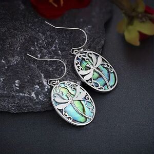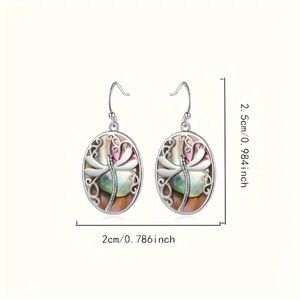 Vintage Style Oval Carved Silvertone Dragonfly Decorative Drop Dangle Earrings Bohemian
