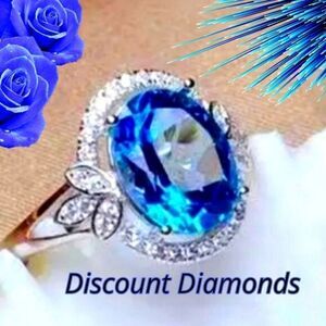 Beautiful Blue Oval Halo Sapphire Cocktail Ring surrounded by Baguette Diamonds on a 925 Sterling Silver Band.