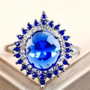Gorgeous Blue Oval Sapphire surrounded by simulated Baguette diamonds followed by a final wrap of dainty blue Sapphire.