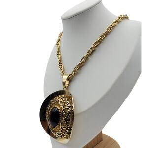 Oval Filigree Pendant Necklace Gold Tone Rope Chain Faux Black Onyx Vintage 70s