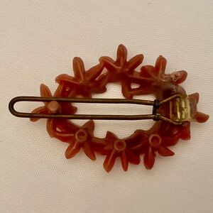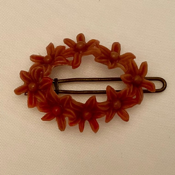 Very old oval flower wreath pink celluloid hair barrette. 1.5" Long x 1" Wide