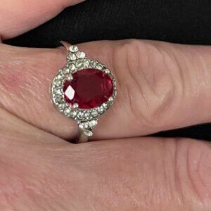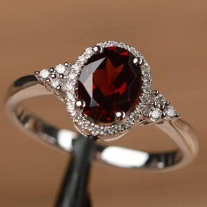 An oval-cut garnet glows at the center, encircled by a halo of brilliant moissanite stones. Set in polished sterling silver, this ring exudes timeless elegance and refined sparkle