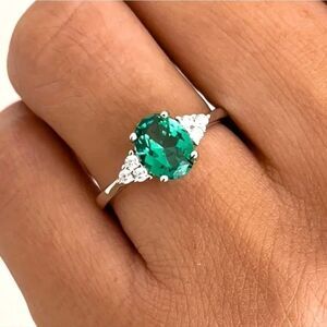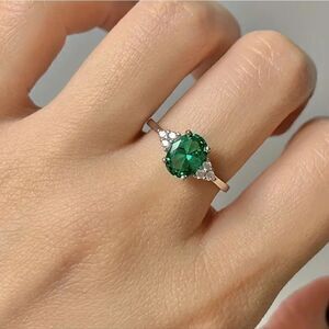 Oval Green Emerald Tone Gemstone and Zircon Ring:
