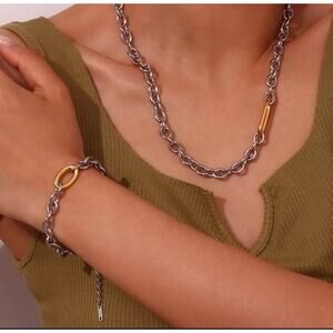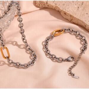 Oval Link Stainless Steel 18K Gold Necklace Bracelet Set Industrial Urban NEW